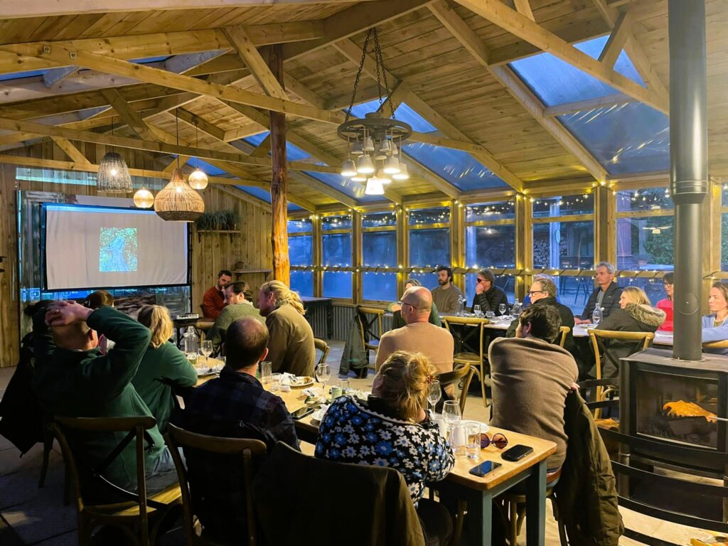 Afterwards, we listened to Matt Chatfield and Ben Thomas talk about their farming systems. Matt told us about his years working as a delivery driver, delivering food to high end restaurants in London and how that has helped him take on his family’s farm and sell cull yaw which are older sheep, fattened for at least 6 months on his pasture and in his woods, hung for 5 weeks to produce a high end product that he sells to restaurants. His system is simple but his depth of knowledge of the hospitality trade, what chefs look for in a carcass and the ecological status of his land is amazing.